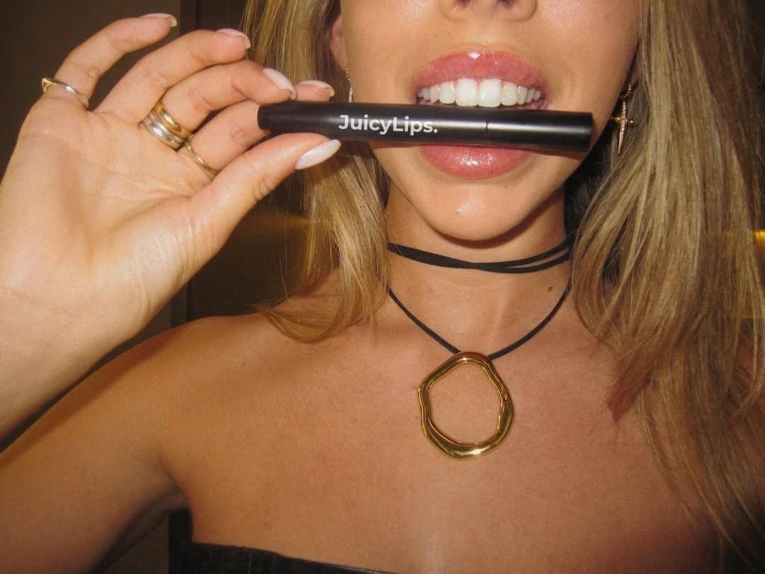 JuicyLips Extreme Lip Plumper – Produkt und Verpackung auf weißem HintergrundClose-up glänzender Lippen mit JuicyLips Korean Lip Plumper – natürlicher Glanz und Volumen